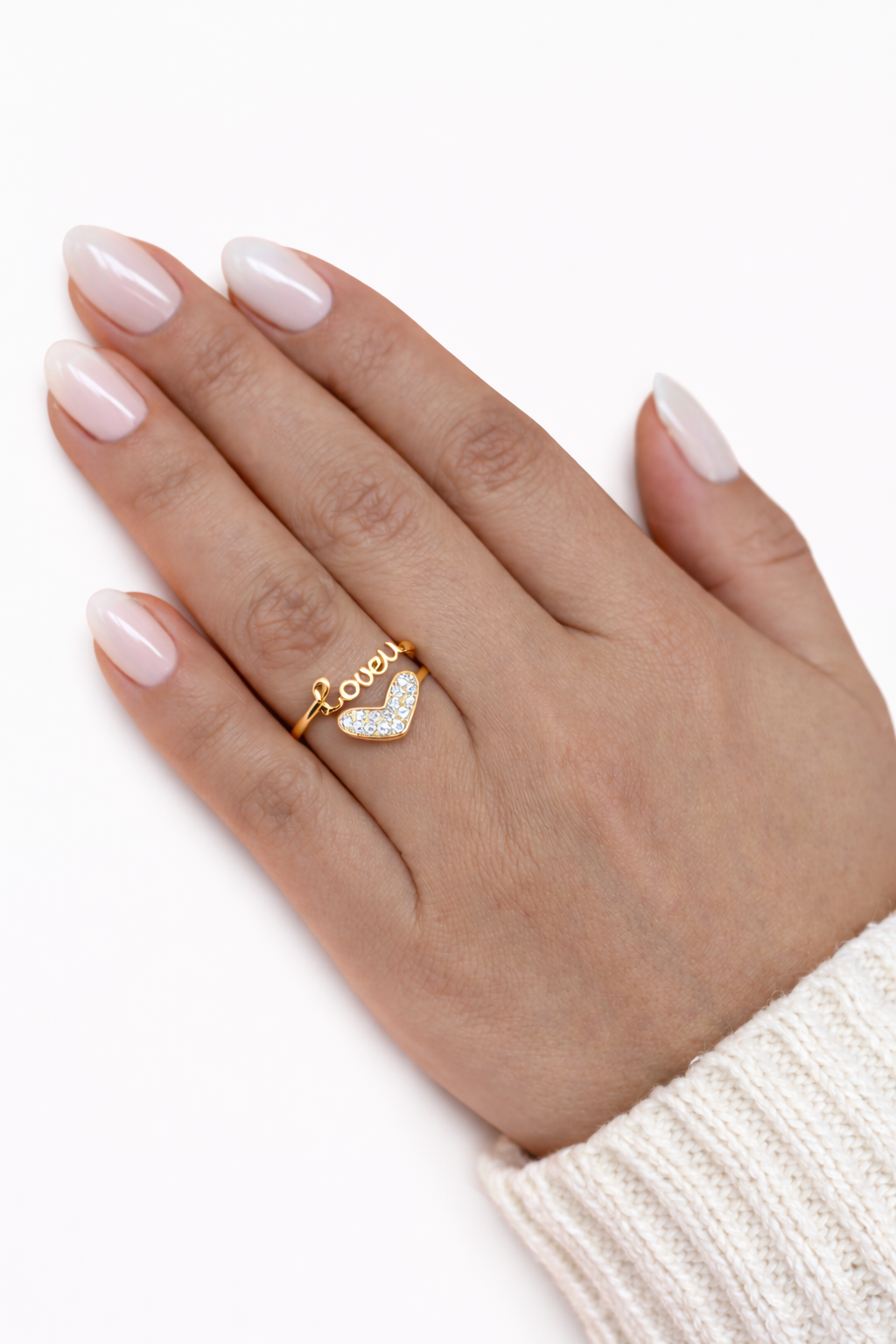 Anel Love Coração Cravejado – Banhado a Ouro 18k, Regulável e Antialérgico