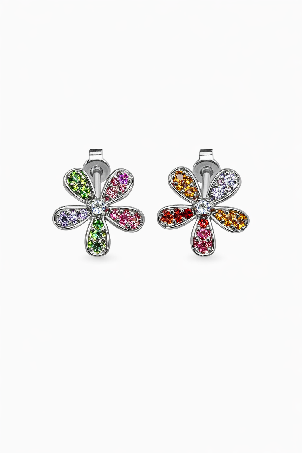 Brinco Flor Cravejado Colorido – Banhado Ródio Branco