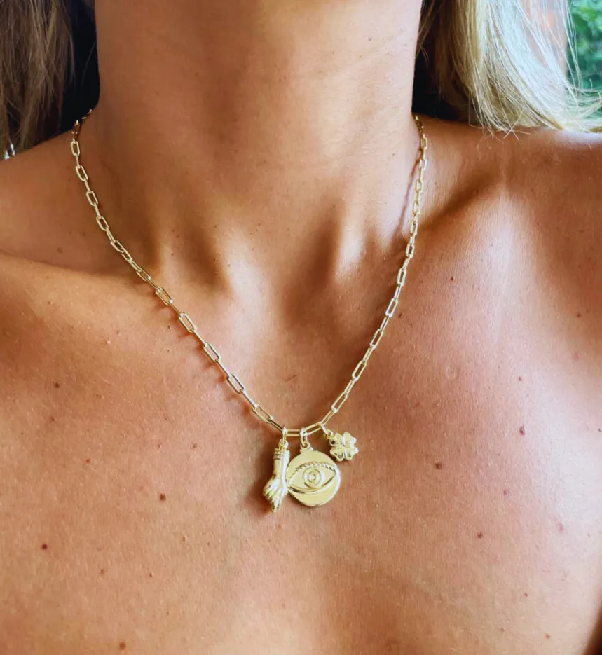 Um acessório cheio de significado e estilo, o Colar Patuá é a escolha perfeita para quem busca proteção e boas energias sem abrir mão da modernidade. Banhado a ouro 18k, ele combina o olho grego, símbolo de proteção contra energias negativas e mau-olhado, com o trevo da sorte, ícone clássico de prosperidade e felicidade.