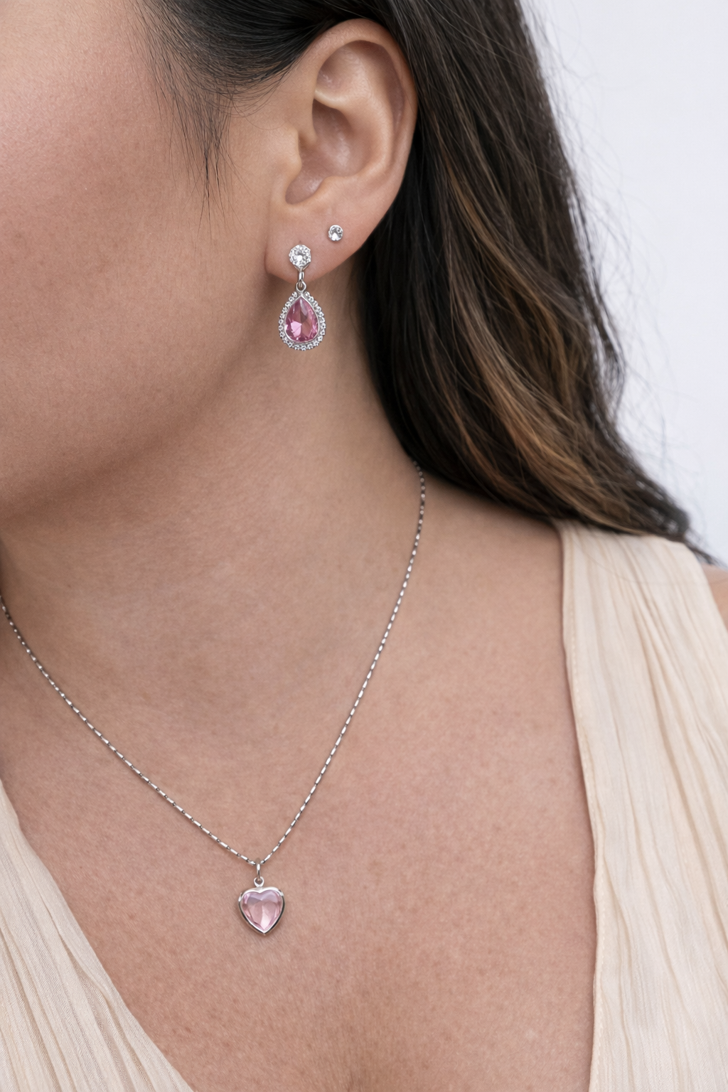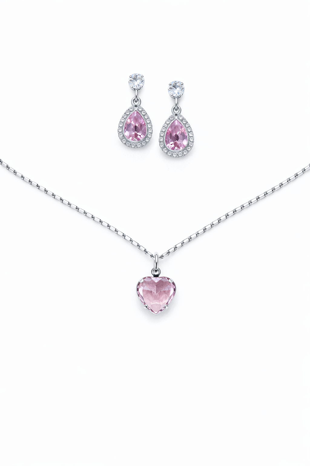 O colar possui um delicado pingente em formato de coração, realçado pelo brilho do banho em ródio branco e pela pedra rosa que traz feminilidade e charme. Já os brincos apresentam o clássico formato de gota, totalmente cravejados, garantindo um visual marcante e iluminado.
